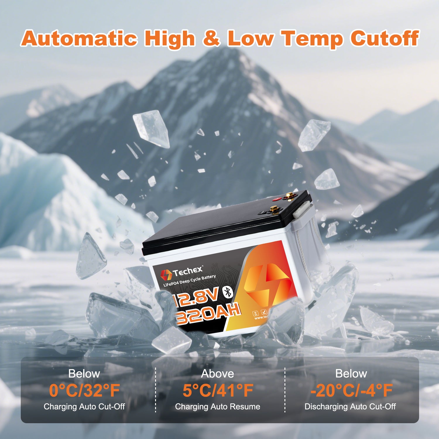 【4S4P & Long-Term Reliability】 Techex 12V 320Ah lithium battery supports 4S4P configuration, reaching 51.2V 1280Ah, delivering an upgraded capacity of 65.536KWh. With over 6000+ deep cycles and a 10-year lifespan, it's perfect for DIY battery systems and ideal for home energy storage, RVs, and other off-grid applications