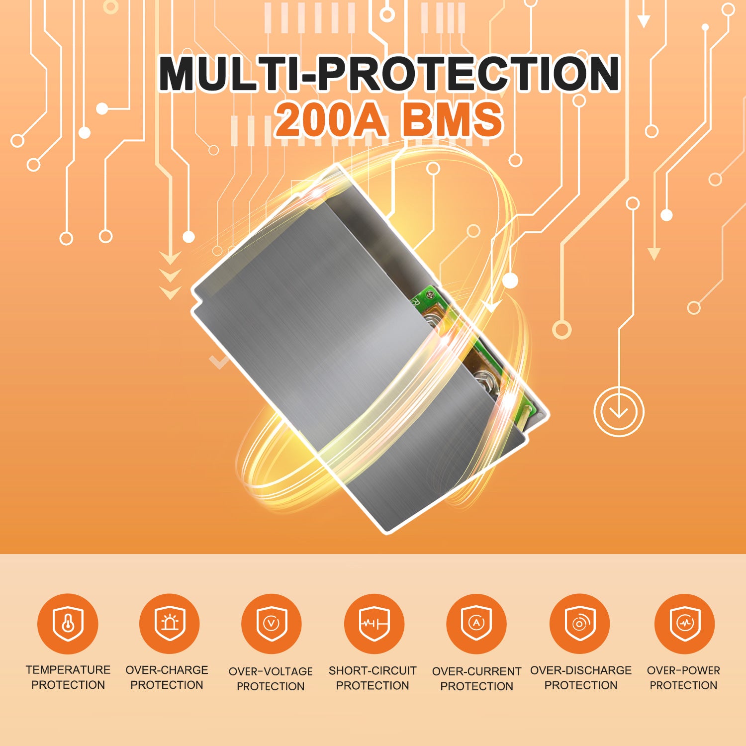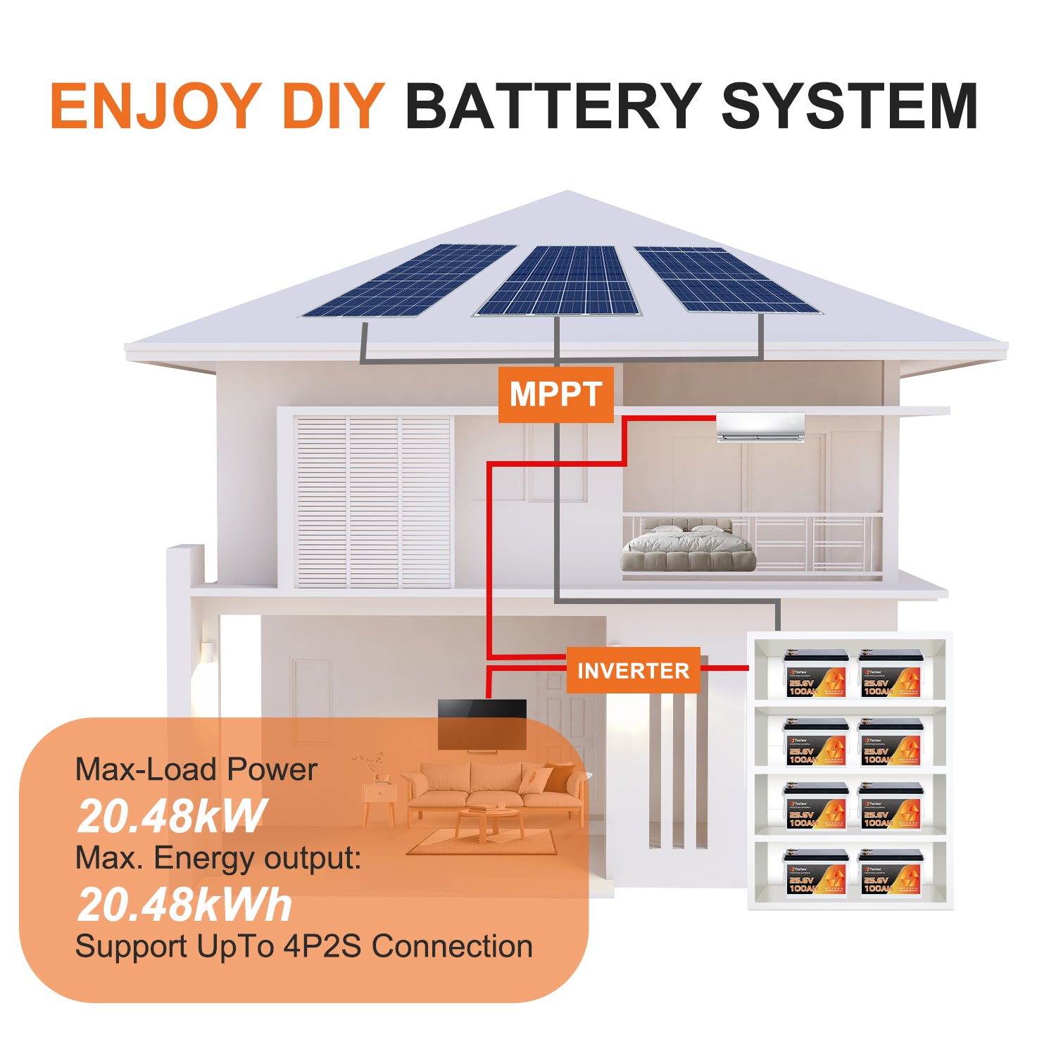 【2S4P Expandable – Up to 20.48kWh】 With support for 2S4P configuration, this battery system can be expanded to a total capacity of 20.48kWh—perfect for users who need flexible energy scaling. Whether you're running an RV, marine setup, solar storage, or backup power system, it grows with your needs while maintaining top-tier performance and easy portability