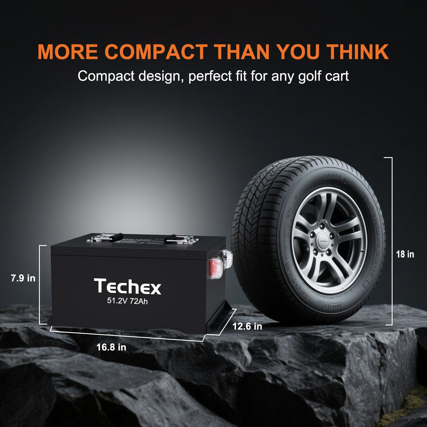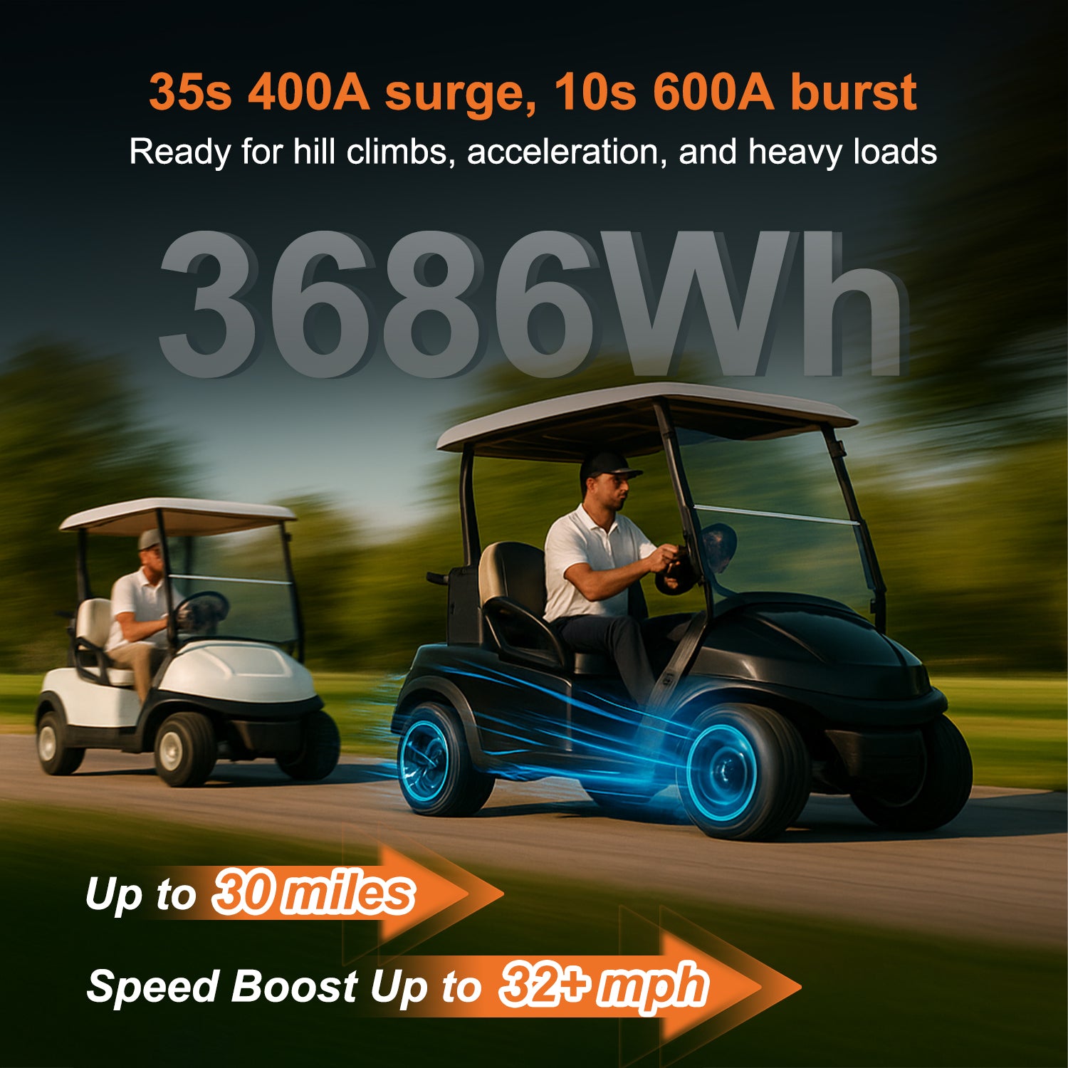 【58.4V Fast Charger & Plug-and-Play】 Includes 58.4V/18A charger for 4-hour full charges – power 2-3 hours of continuous driving or 2+ golf rounds (only 9% battery used per round). Direct lead-acid replacement with no wiring, no maintenance – installs in minutes. Lighter weight enables faster swaps and longer play with zero downtime